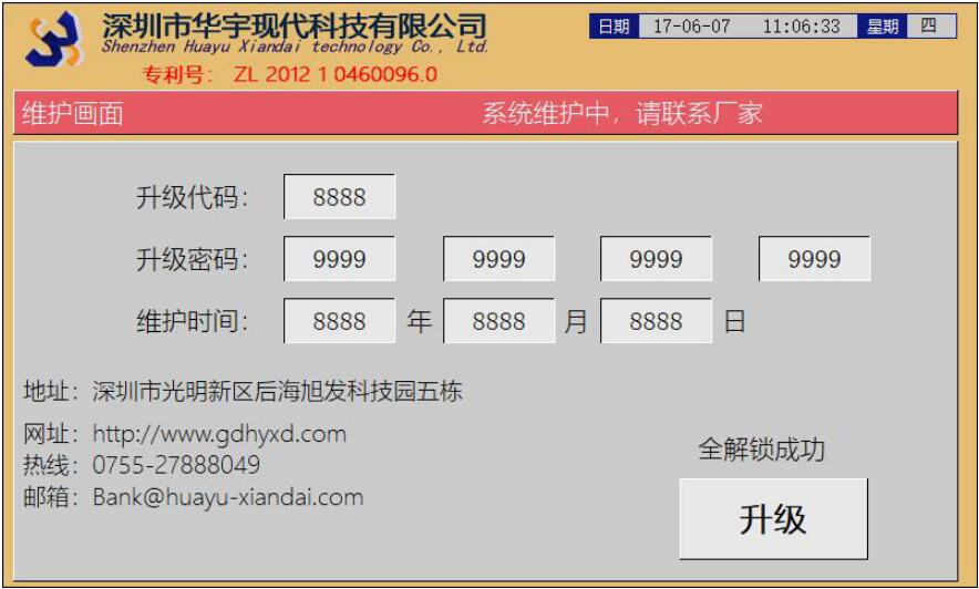 【升級(jí)】:客戶在輸入密碼后點(diǎn)擊此按鈕,系統(tǒng)將根據(jù)密碼輸入的值來(lái)判定密碼的正確性,并提示是否升級(jí)成功。解鎖成功后斷電再上電即可解除本次期限。