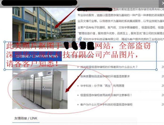 深圳市華宇現(xiàn)代科技有限公司擁有一項恒溫恒濕存儲柜國家發(fā)明專利,和多項相關(guān)的結(jié)構(gòu)新型及軟著專利。產(chǎn)品廣泛用于外資企業(yè),大企業(yè),企業(yè)集團,軍工,醫(yī)藥,博物館,檔案館。最近發(fā)現(xiàn)市面有很多貿(mào)易公司或五金生產(chǎn)廠家,在線下或網(wǎng)絡(luò)上盜用我司的產(chǎn)品資料及圖片進行不良銷售活動。更有甚者以華宇現(xiàn)代的品牌私下接單,但實際銷售的產(chǎn)品卻是不具備恒溫恒濕功能的非我司產(chǎn)品?。ɡ绾蜕钲谑腥A宇現(xiàn)代科技有限公司相似名稱來取名以混淆客戶,更有甚者,其網(wǎng)上全部圖片盜用華宇現(xiàn)代產(chǎn)品圖片,以蒙騙客戶(可以進入華宇現(xiàn)代官網(wǎng)www.cxdongjie.com比較即知))